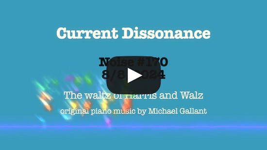Thank you for subscribing to Current Dissonance. This is a public post, so please feel free to share it: These last several weeks, America’s snap transformation in electoral politics has inspired countless buckets of words across countless media sources—so I’m going to cut straight to my musical take on the whole thing. Thanks so much for being part of Current Dissonance. I hope you enjoy Noise #170: The waltz of Harris and Walz: Wishing you peace, Michael (Noise #170 by Michael Gallant. Copyright 2024 Gallant Music LLC. All Rights Reserved.) You're currently a free subscriber to Current Dissonance. For the full experience, upgrade your subscription. |